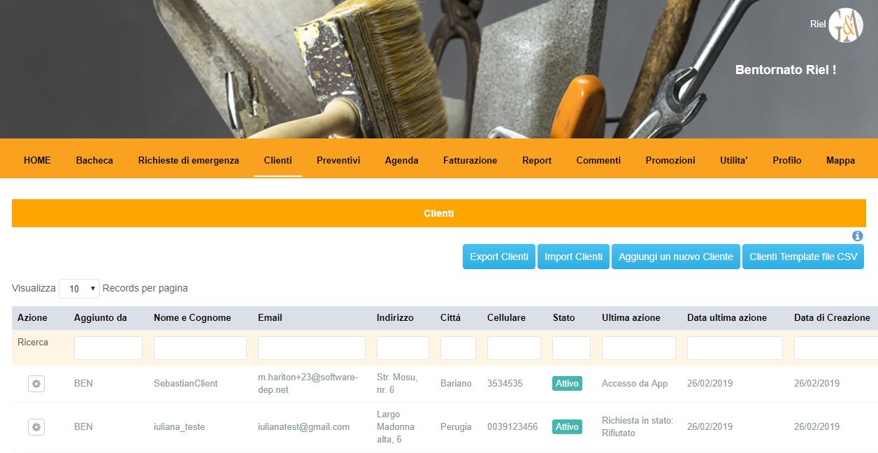 Modifica - Permette di modificare i dati anagrafico dell'utente, gli indirizzi, le scadenze per manutenzioni periodiche o interventi pianificati con regolarità, visualizzare lo storico delle sue richieste.
