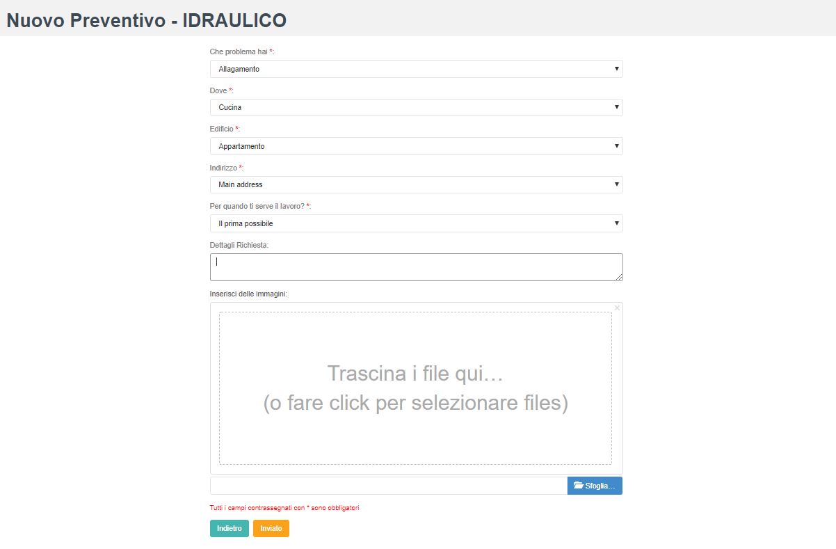 Seleziona il servizio per cui vuoi creare il preventivo. Compila i campi nella schermata successiva relativi alla problematica in essere. Puoi anche allegare immagini.