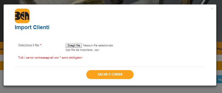 Nella finestra che compare, selezionare il file CSV contenente le anagrafiche dei clienti da importare. Premere il pulsante 'Salva e chiudi'.